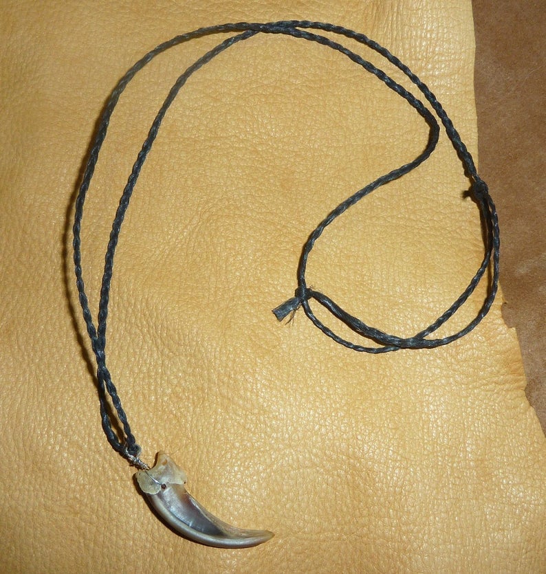 When you order, please choose from either black, red-brown, or natural-colored artificial sinew, or a braid of all three (colors may be seen in the third picture); otherwise I will choose at my discretion. The necklace in the picture is a sample; these are made to order. Please allow for natural variation in the shape and coloring of the claw.