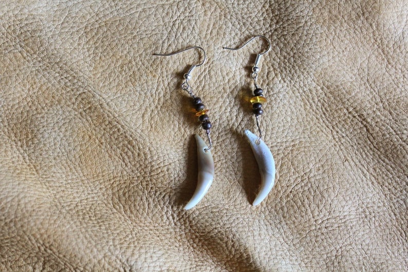 Description: Beautiful ivory-colored real red fox canine teeth are accented by real amber and secondhand wooden beads for a very eye-catching pair of earrings!